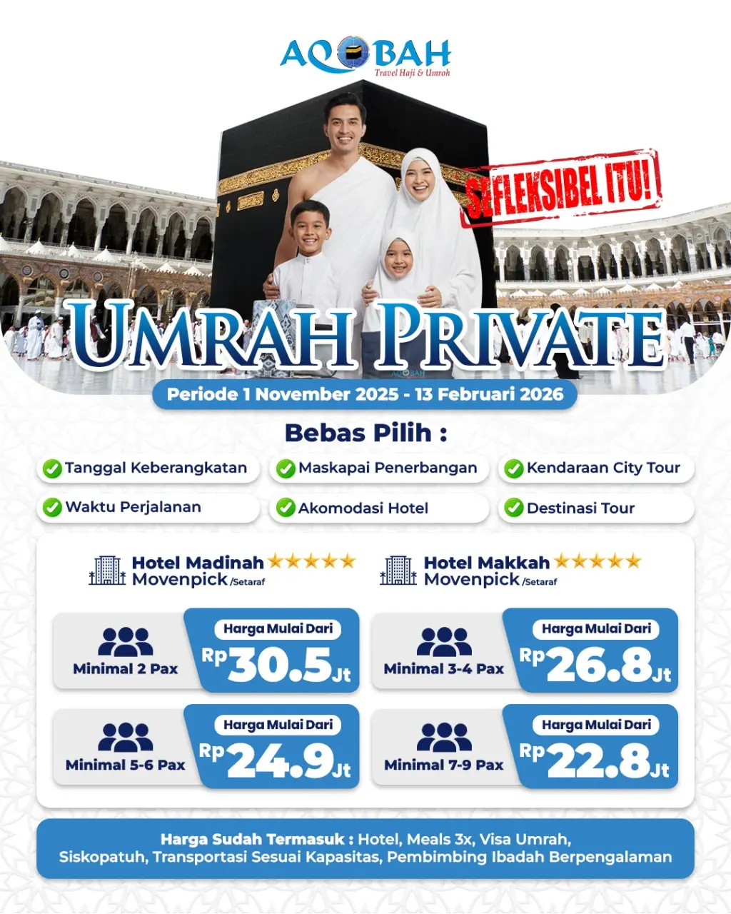 Umrah Private adalah layanan perjalanan spiritual Umrah yang dirancang eksklusif, fleksibel, dan bersifat personal hanya untuk Sahabat.