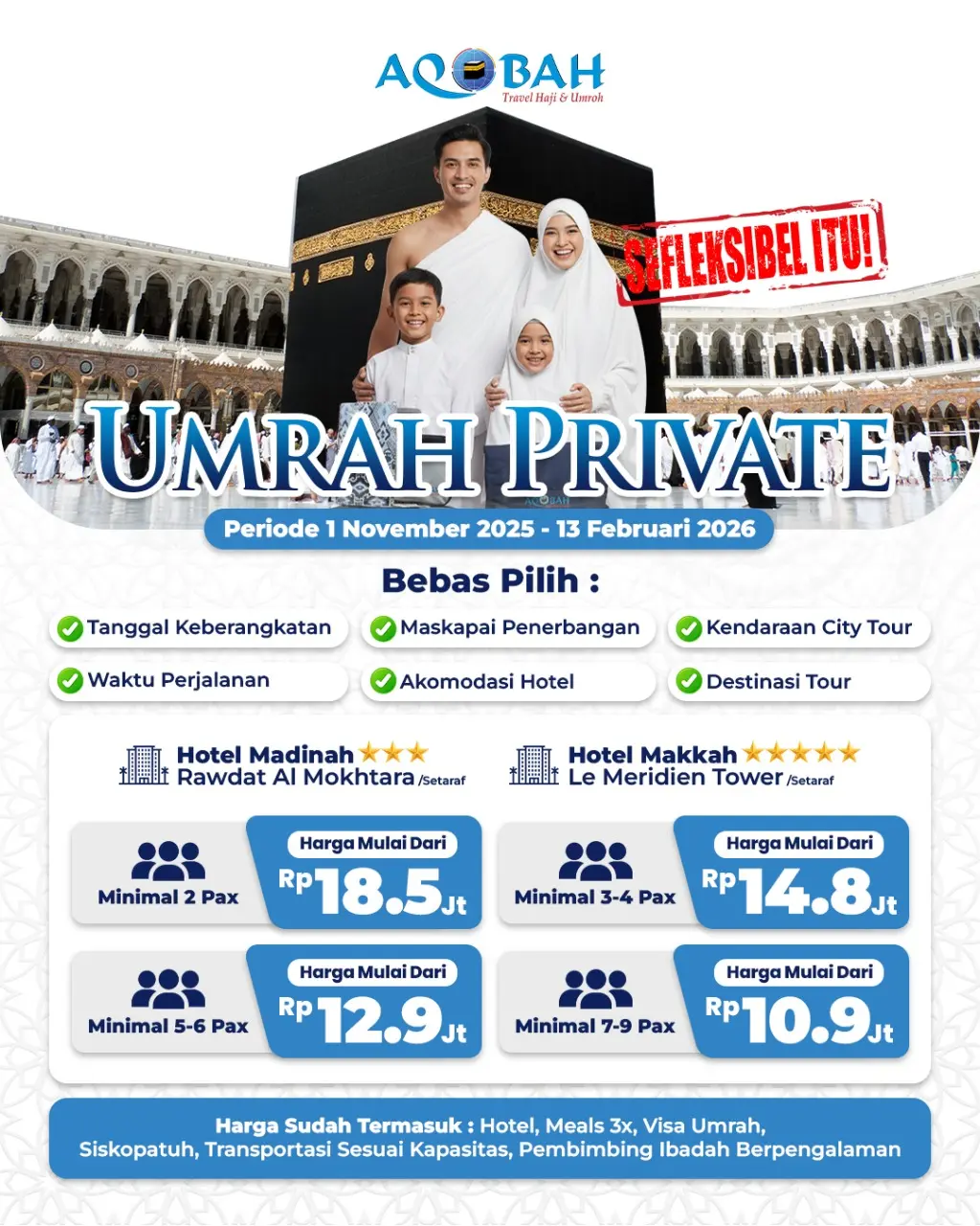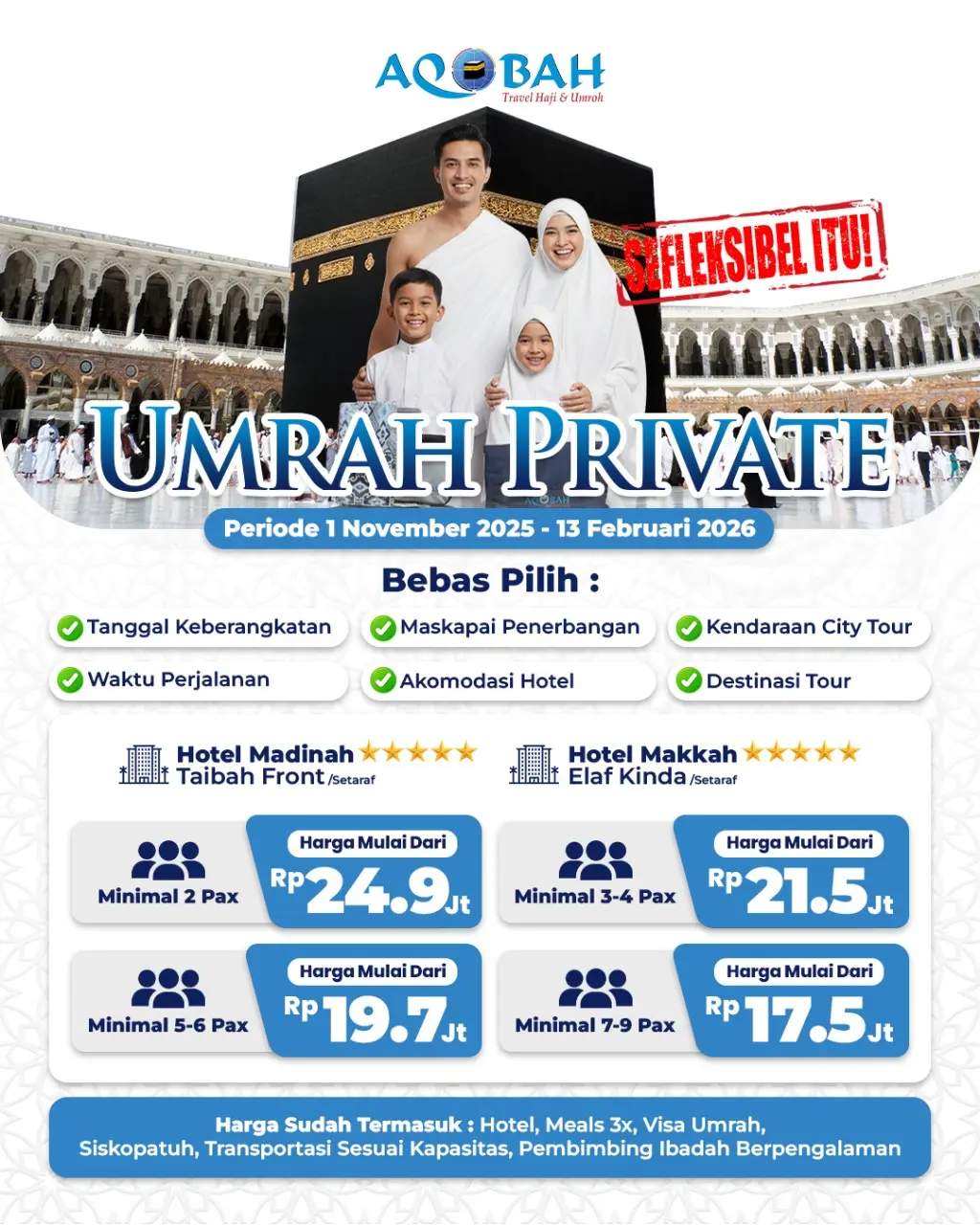 Paket ini menawarkan privasi maksimal dan fasilitas yang menyesuaikan untuk memastikan kekhusyukan ibadah tanpa gangguan.