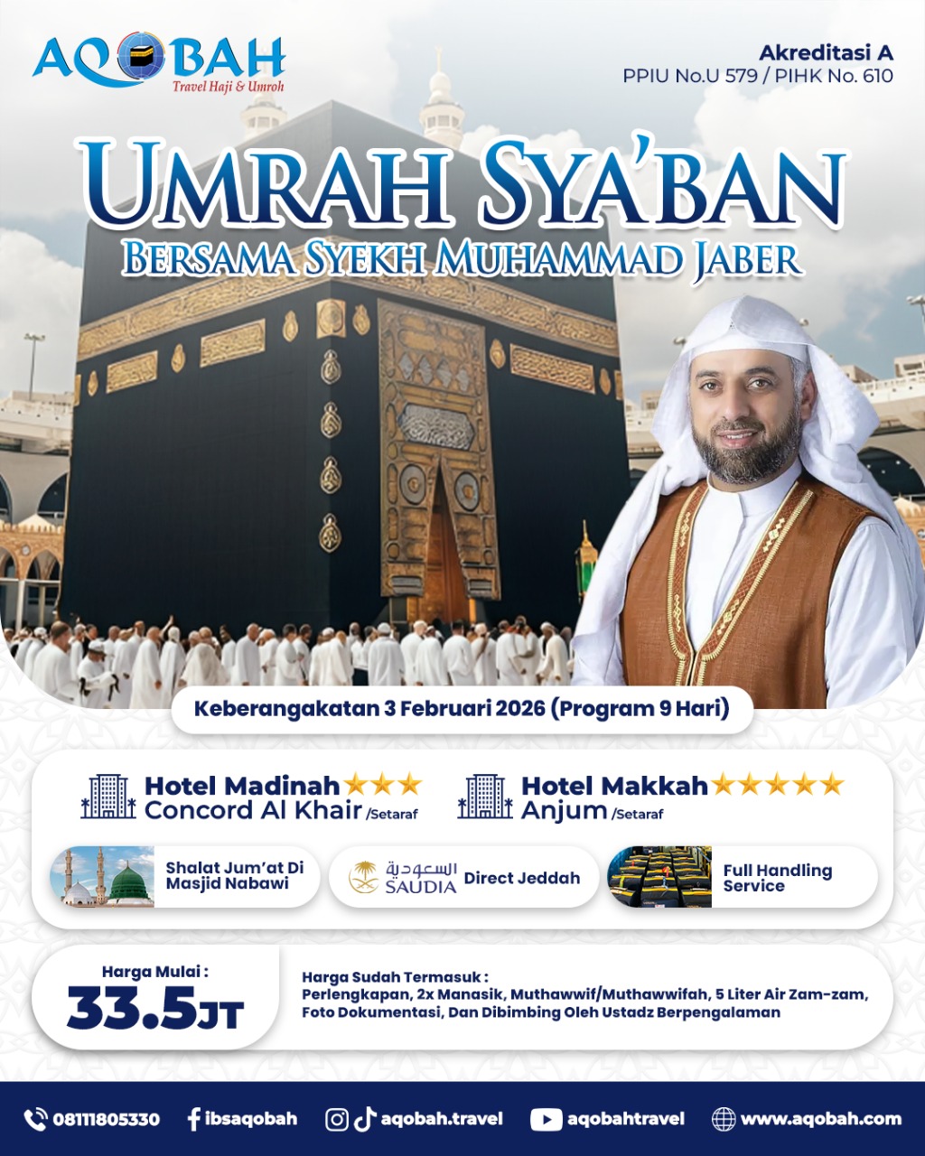 Bukan sekadar menunaikan rukun, tapi memperbaiki kualitas diri. Dapatkan bimbingan intensif, kajian eksklusif, dan momen spiritual tak terlupakan langsung bersama Syekh Muhammad Jaber. Umrah di bulan Sya'ban Februari 2026.